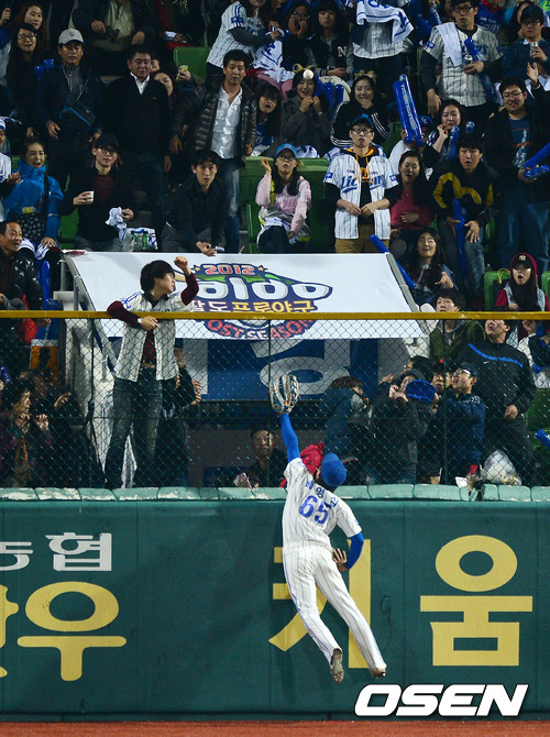 25일 오후 대구구장에서 열린 2012 팔도 프로야구 삼성 라이온즈와 SK 와이번스의 한국시리즈 2차전, 6회초 무사에서 삼성 배영섭이 SK 정근우의 타구에 몸을 날려보지만 펜스를 넘어 홈런이 되고 있다.