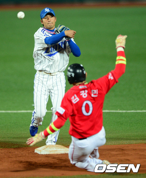 25일 오후 대구구장에서 열린 2012 팔도 프로야구 삼성 라이온즈와 SK 와이번스의 한국시리즈 2차전, 7회초 무사 1루에서 삼성 김상수가 SK 박정권의 내야땅볼을 잡아 김강민을 포스아웃시키고 1루로 송구하고 있다.