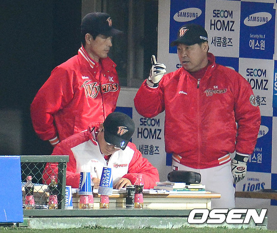 25일 오후 대구구장에서 열린 2012 팔도 프로야구 삼성 라이온즈와 SK 와이번스의 한국시리즈 2차전 경기 7회말 2사 2루 박석민이 1타점을 추가하자 이만수 감독이 성준 코치에게 투수 교체를 지시하고 있다.