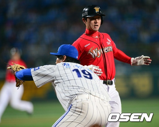25일 오후 대구구장에서 열린 2012 팔도 프로야구 대구 라이온즈와 SK 와이번스의 한국시리즈 2차전 경기, 8회초 1사 1,2루 박재상 타석때 2루 주자 김성현이 삼성 정현욱 투수의 와일드 피칭을 틈타 홈까지 쇄도 득점을 올리고 있다.