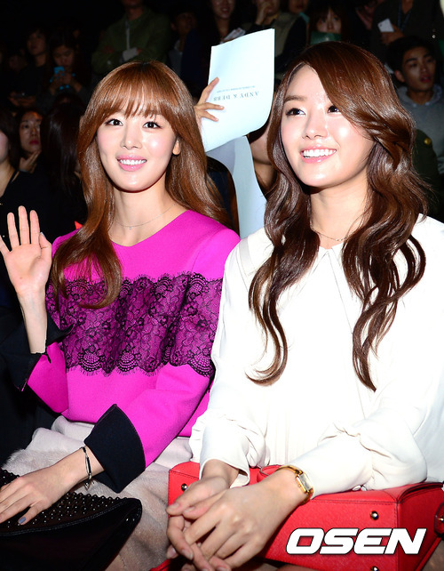 26일 오후 서울 용산 전쟁기념관에서 열린 '2012 추계 서울패션위크' 김석원&윤원정 디자이너 패션쇼에 참석한 시크릿 한선화, 송지은이 포토타임을 갖고 있다.