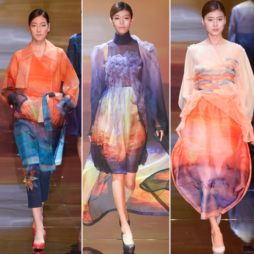 특히 드레스 끝자락에 표현된 그라데이션은 네이비, 오렌지, 옐로우, 그린 등이 한데 섞여 몽환적이면서도 우아한 이미지를 표출하고 있었다. 정 디자이너의 노련함(?)이 엿보였던 순간이었다. 그러데이션을 드레스 끝자락에 주어 고의적으로 관객들의 시선을 밑으로 끌어내린듯 보였다.