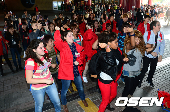 K-POP 월드페스티벌 참가자들이 공개홀에서 입장을 기다리며 가수 싸이의 '강남스타일'에 맞춰 춤을 추고 있다.