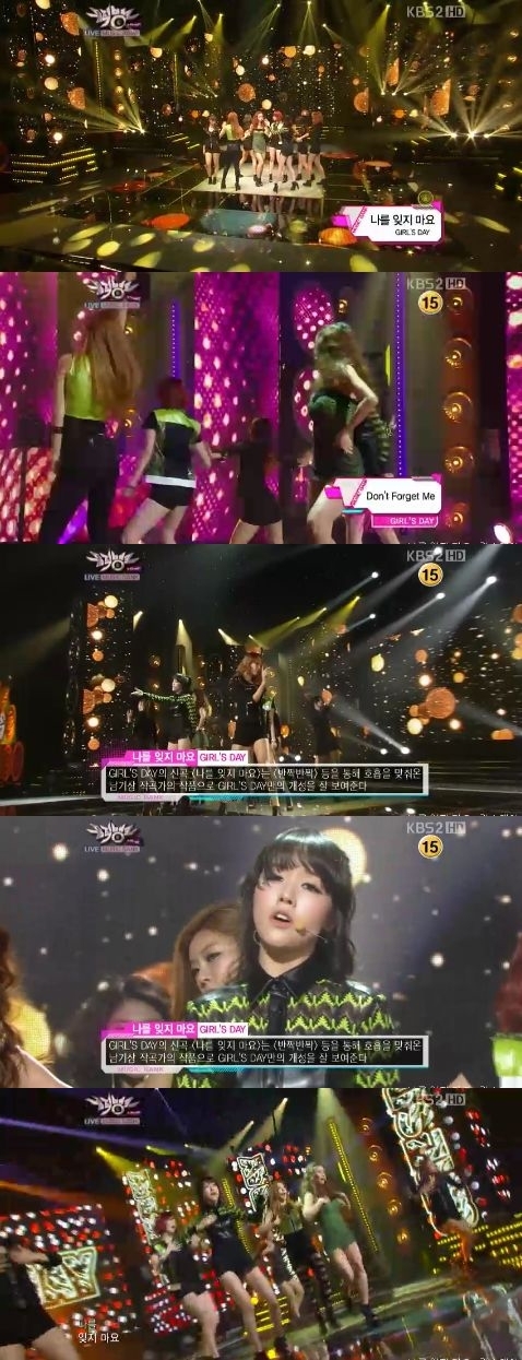 '나를 잊지마요'는 첫사랑의 설렘과 이별의 아쉬움 등을 아날로그 감성으로 풀어낸 곡이다. 걸스데이는 이날 컴백 무대에서 첫사랑의 아련함을 특유의 소녀감성과 귀여운 매력으로 풀어내며 가을철 감성을 자극했다.