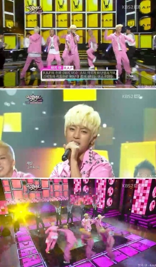 B.A.P는 26일 오후 6시 방송된 KBS 2TV '뮤직뱅크'에 출연해 세 번째 싱글 '하지마'로 누나팬들의 마음을 녹이는 무대를 선보였다.