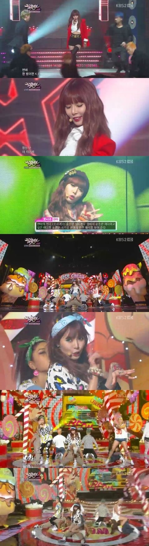 현아는 26일 오후 6시 방송된 KBS 2TV '뮤직뱅크'에서 유튜브 천만 클릭을 이끌어낸 신곡 '아이스크림'을 비롯해 수록곡 '흐트러지지마', '풋사과'로 화끈한 무대를 선사했다.