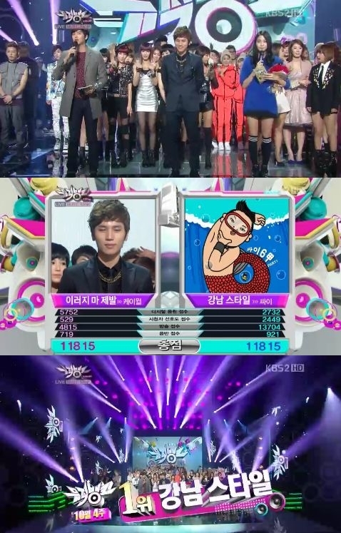 싸이는 26일 방송된 '뮤직뱅크'에서 케이윌의 '이러지마 제발'을 큰 표 차이로 꺾고, 1위를 차지했다.