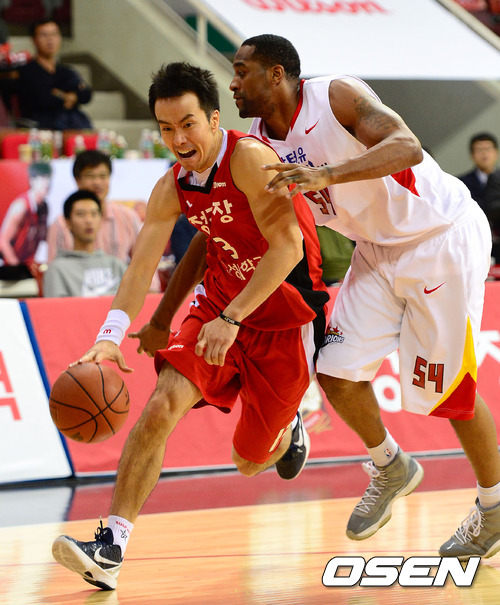 26일 오후 안양실내체육관에서 열린 KB 국민카드 2012-2013 프로농구 KGC인삼공사와 오리온스의 경기, 2쿼터 인삼공사 김성철이 오리온스 윌리엄스를 돌파하고 있다.