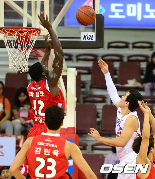 26일 오후 안양실내체육관에서 열린 KB 국민카드 2012-2013 프로농구 KGC인삼공사와 오리온스의 경기, 2쿼터 인삼공사 파틸로가 슛블록에 성공하고 있다.