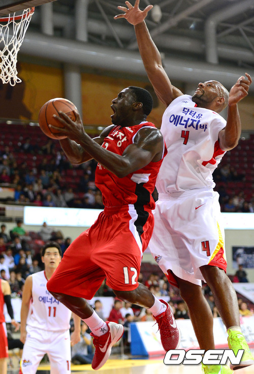 26일 오후 안양실내체육관에서 열린 KB 국민카드 2012-2013 프로농구 KGC인삼공사와 오리온스의 경기, 2쿼터 인삼공사 파틸로가 오리온스 윌리엄스의 수비를 피해 슛을 시도하고 있다.