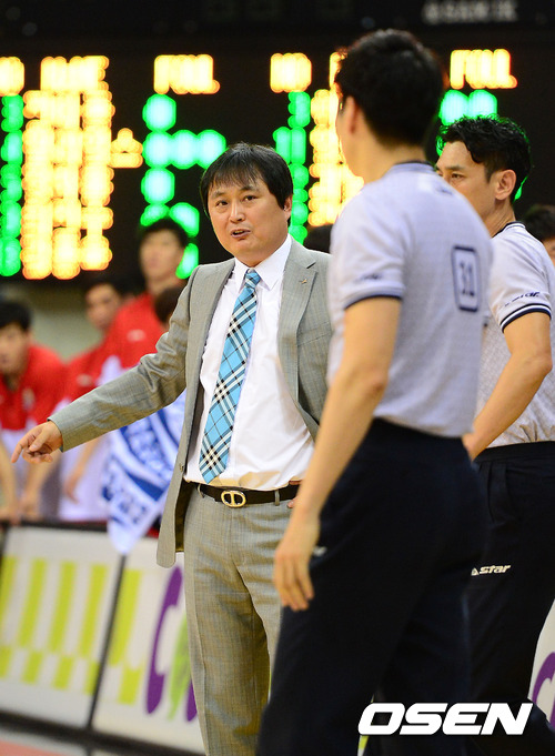 26일 오후 안양실내체육관에서 열린 KB 국민카드 2012-2013 프로농구 KGC인삼공사와 오리온스의 경기, 3쿼터 종료 직전 인삼공사의 수비 파울이 선언되자 이상범 감독이 심판진에 어필하고 있다.