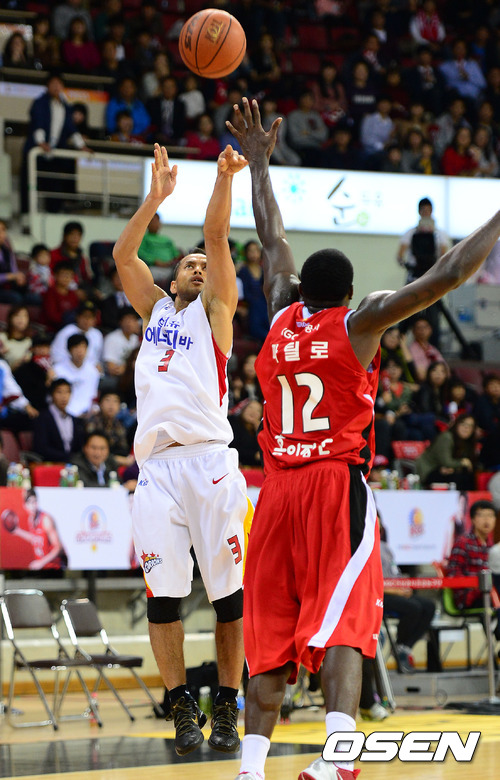 26일 오후 안양실내체육관에서 열린 KB 국민카드 2012-2013 프로농구 KGC인삼공사와 오리온스의 경기, 4쿼터 오리온스 전태풍이 3점슛을 시도하고 있다.