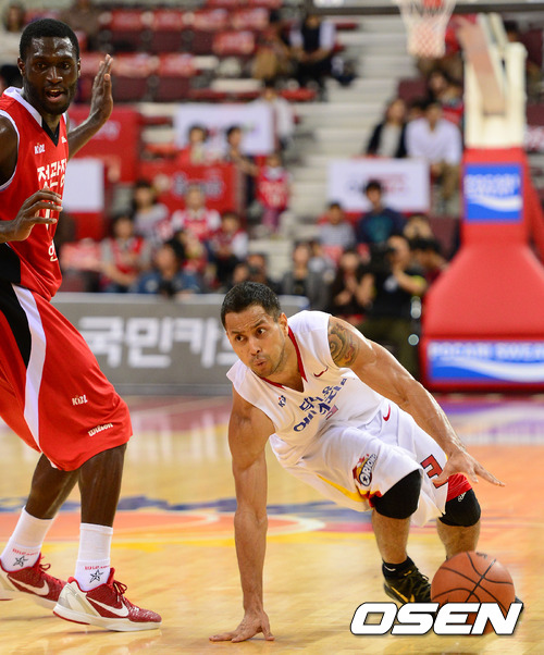 26일 오후 안양실내체육관에서 열린 KB 국민카드 2012-2013 프로농구 KGC인삼공사와 오리온스의 경기, 4쿼터 오리온스 전태풍이 드리블 돌파 중 넘어지고 있다.