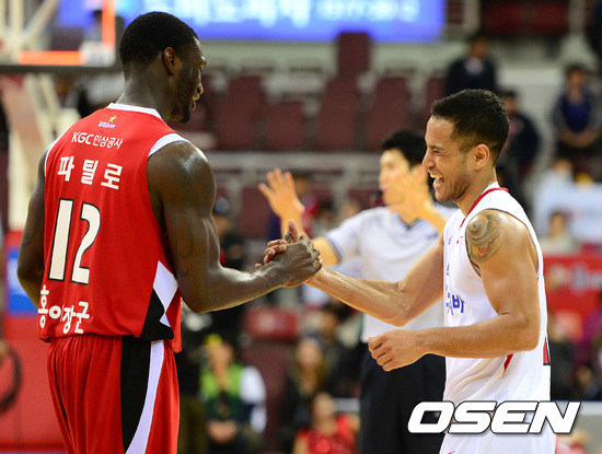 26일 오후 안양실내체육관에서 열린 KB 국민카드 2012-2013 프로농구 KGC인삼공사와 오리온스의 경기, 경기 종료 후 오리온스 전태풍과 인삼공사 파틸로가 인사를 나누고 있다.