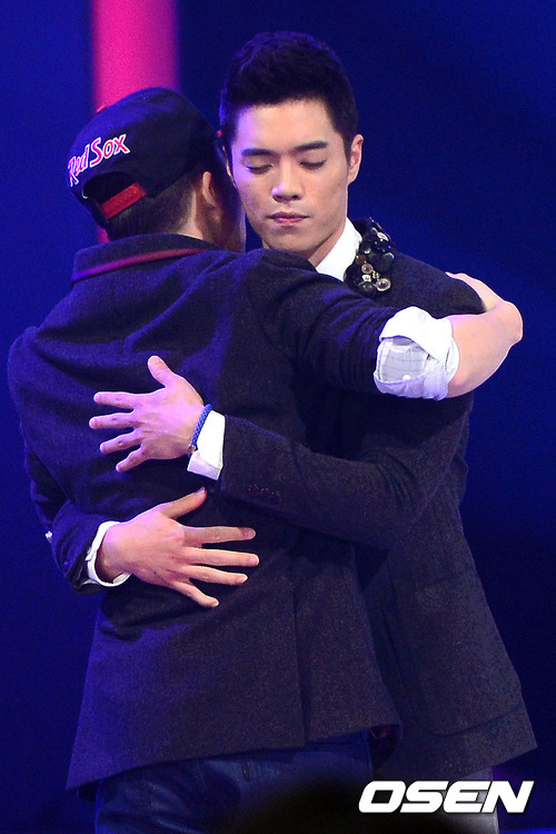 26일 오후 서울 경희대 평화의 전당에서 진행된 '슈퍼스타K4'에서 탈락한 허니지와 김정환이 포옹을 하고 있다.