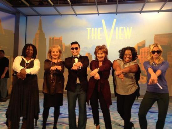 싸이는 공개된 사진 속에서 '토크쇼의 여왕'이라 불리는 바바라 월터스를 비롯해 패널들과 말춤 동작을 한 채 미소 짓고 있다.