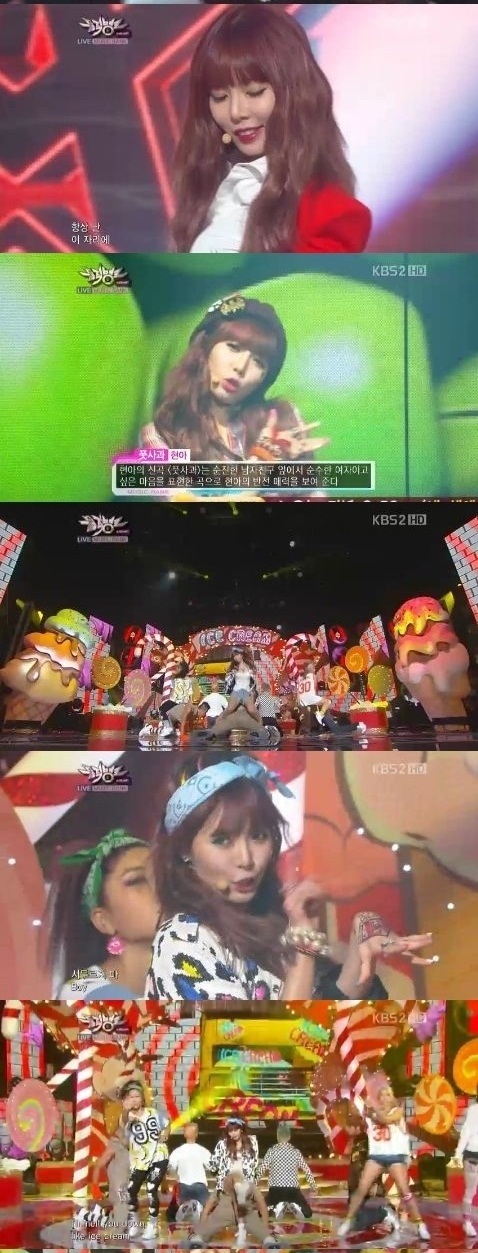 이날 현아는 '아이스크림' 이외에도 '흐트러지지마', '풋사과' 등의 다양한 무대를 선보였다. 그는 '흐트러지지마'를 통해 '트러블메이커' 때의 섹시함을 어필했고, '풋사과'로는 발랄한 여대생 느낌을 내뿜으며 상큼함도 챙겼다.