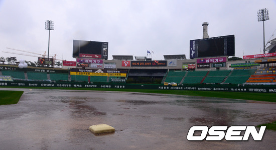 문학구장 그라운드에 방수포를 씌우지 않은 모습이 눈길을 끈다.