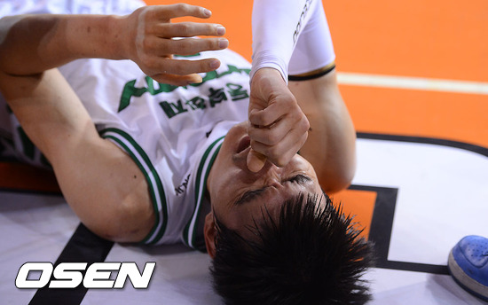 27일 오후 인천 삼산실내체육관서 열린 '2012-2013 KB국민카드 프로농구' 인천 전자랜드와 원주 동부의 경기 2쿼터 동부 김주성이 전자랜드 포웰과 부딫혀 쓰러져 있다.