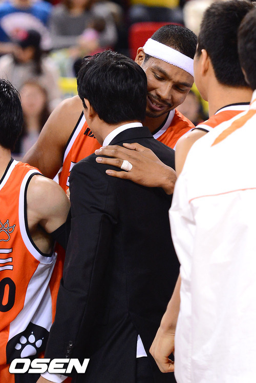 신기성이 문태종과 포옹을 하고 있다