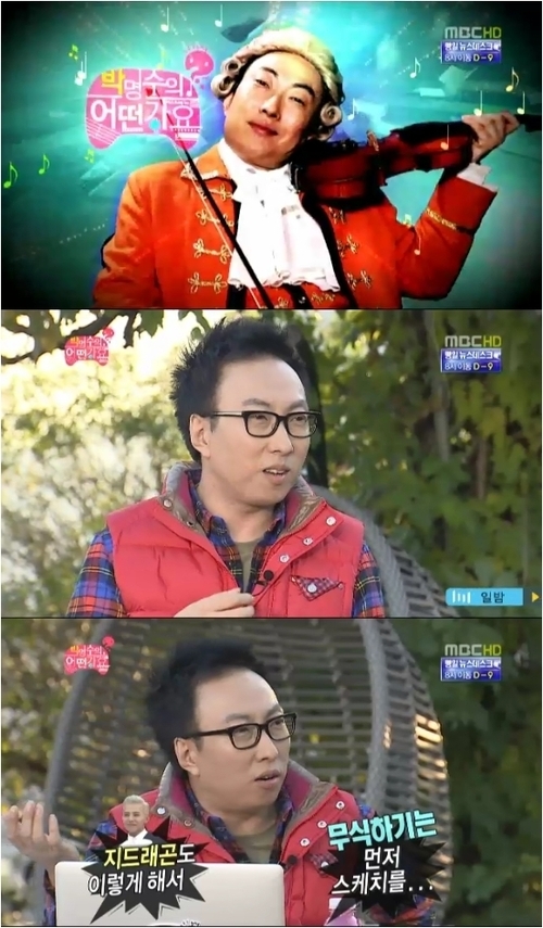 27일 방송된 MBC 예능 프로그램 ‘무한도전’은 연말 특집 공연에 사용할 노래를 준비하는 멤버들의 이야기가 공개됐다. 작곡 공부를 하고 있는 박명수가 주축이 된 ‘박명수의 어떤가요’ 특집이 바로 그것.