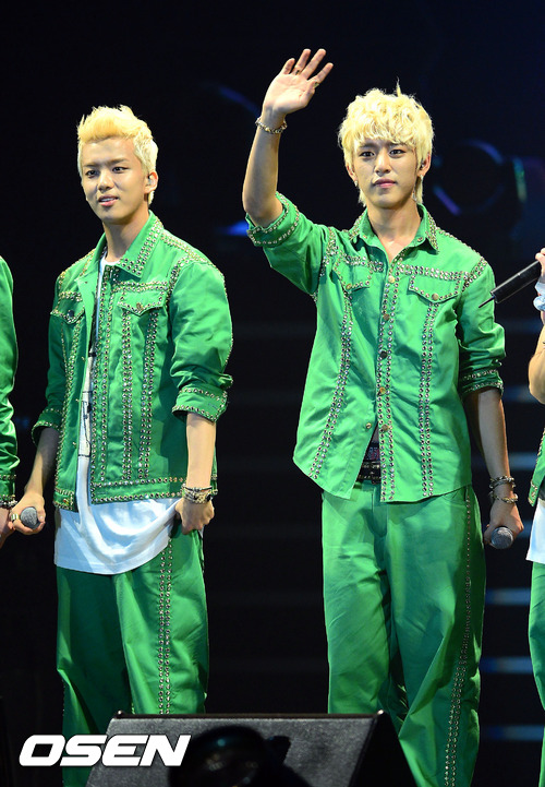 27일 오후 고려대 화정체육관에서 진행된 그룹 B.A.P '팬클럽 창단식'에서 BAP 종업과 대현이 팬들에게 인사를 하고 있다.