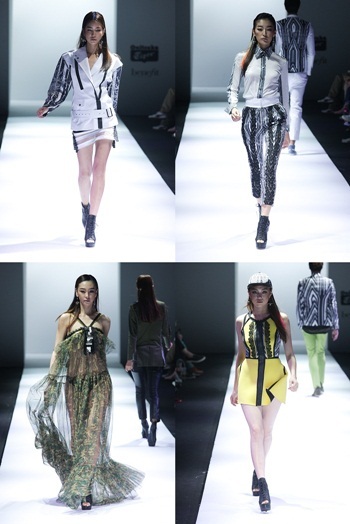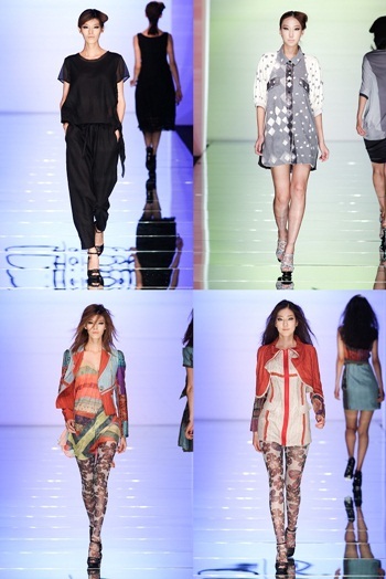 런웨이 시작은 블랙 컬러 의상들로 약간은 동양적인 느낌이 풍기면서 편안해 보이는 의상들이 보여 지더니 이내 도트와 지그재그 패턴이 어우러진 그레이 톤의 옷들로 이어졌다. 그리고 마지막에는 오렌지와 그린 컬러를 바탕에 둔 화려한 색감의 의상들이 런웨이를 채워 관객들의 눈을 지루할 틈이 없게 만들었다.