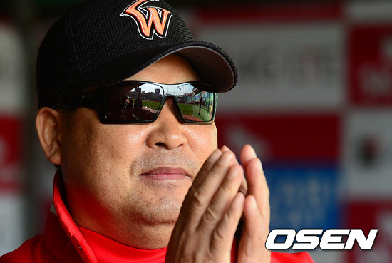 28일 오후 인천 문학구장에서 열린 2012 팔도 프로야구 삼성 라이온즈와 SK 와이번스의 한국시리즈 3차전, 경기에 앞서 SK 이만수 감독이 취재진과 이야기를 나누며 선발 투수 부시가 잘 던져주길 바라는 마음으로 기도 포즈를 취하고 있다.