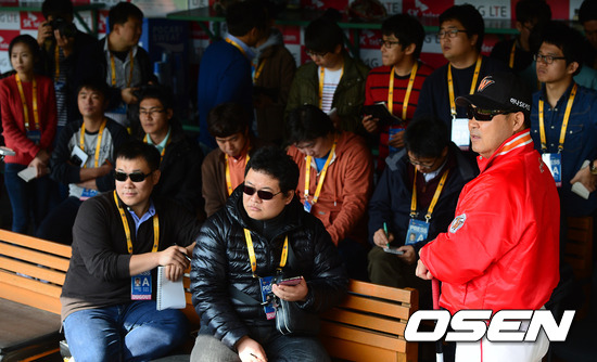 28일 오후 인천 문학구장에서 열린 2012 팔도 프로야구 삼성 라이온즈와 SK 와이번스의 한국시리즈 3차전, 경기에 앞서 SK 이만수 감독이 취재진과 이야기를 나누고있다.