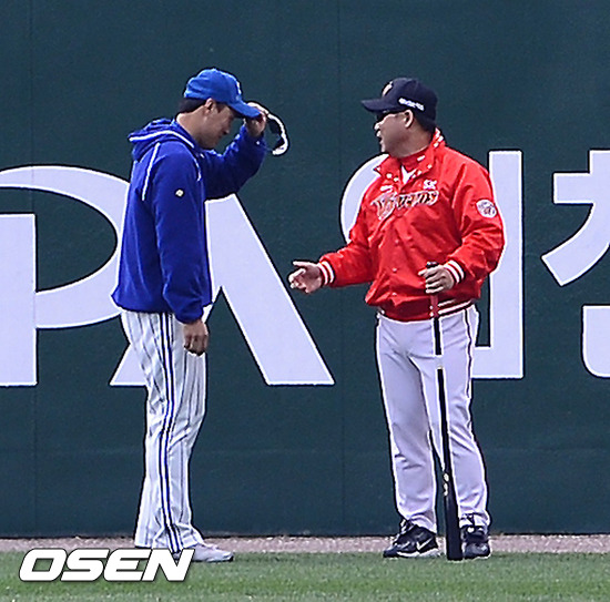 28일 오후 인천 문학구장에서 열린 2012 팔도 프로야구 삼성 라이온즈와 SK 와이번스의 한국시리즈 3차전, 경기에 앞서 SK 이만수 감독이 삼성 이승엽과 이야기를 나누고 있다.