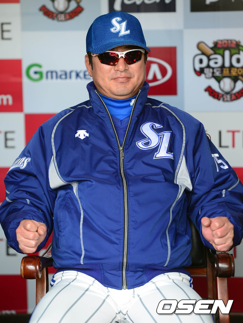 28일 오후 인천 문학구장에서 열리는 '2012 팔도 프로야구' SK 와이번스와 삼성 라이온즈의 한국시리즈 3차전 경기 시작 전 류중일 감독이 취재진들과 인터뷰를 하고 있다.