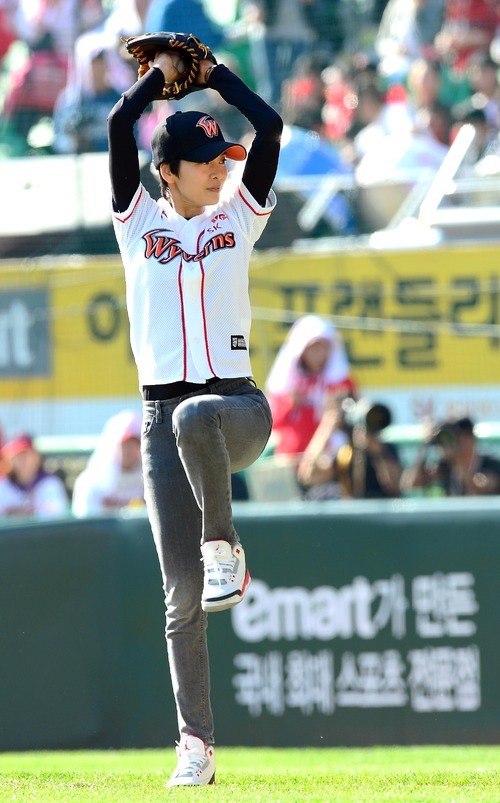 28일 오후 인천 문학구장에서 열린 2012 팔도 프로야구 삼성 라이온즈와 SK 와이번스의 한국시리즈 3차전, 정혜영이 멋진 폼으로 시구를 하고 있다.