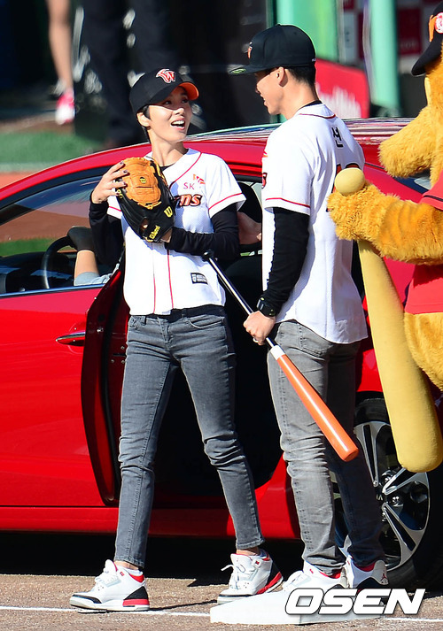 28일 오후 인천 문학구장에서 열린 '2012 팔도 프로야구' SK 와이번스와 삼성 라이온즈의 한국시리즈 3차전 경기 시작 전 션, 정혜영 부부가 시구 시타를 위해 그라운드에 나오고 있다.