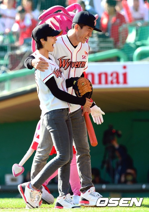 28일 오후 인천 문학구장에서 열린 2012 팔도 프로야구 삼성 라이온즈와 SK 와이번스의 한국시리즈 3차전, 시구 시타를 마친 션과 정혜영이 환하게 웃고 있다.