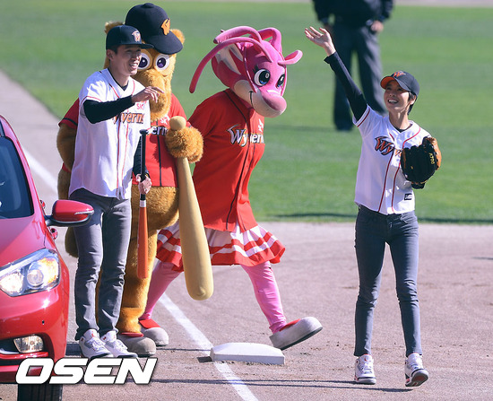 28일 오후 인천 문학구장에서 열린 2012 팔도 프로야구 삼성 라이온즈와 SK 와이번스의 한국시리즈 3차전, 경기에 앞서 션-정혜영 부부가 시구 시타를 위해 그라운드에 나서고 있다