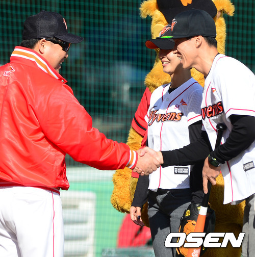 28일 오후 인천 문학구장에서 열린 2012 팔도 프로야구 삼성 라이온즈와 SK 와이번스의 한국시리즈 3차전, 경기에 앞서 션-정혜영 부부가 시구 시타를 마치고 SK 이만수 감독과 인사를 나누고 있다.