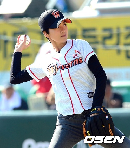 28일 오후 인천 문학구장에서 열린 2012 팔도 프로야구 삼성 라이온즈와 SK 와이번스의 한국시리즈 3차전, 정혜영이 멋진 폼으로 시구 하고 있다.