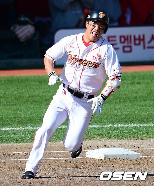 28일 오후 인천 문학구장에서 열린 '2012 팔도 프로야구' SK 와이번스와 삼성 라이온즈의 한국시리즈 3차전 경기 1회말 선두타자 정근우가 좌중간 2루타를 치고 달리고 있다.