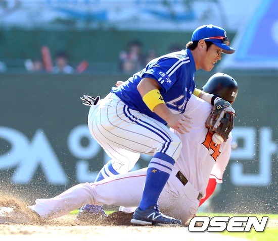 28일 오후 인천 문학구장에서 열린 2012 팔도 프로야구 삼성 라이온즈와 SK 와이번스의 한국시리즈 3차전, 1회말 1사 1루 최정이 2루 도루에 성공하고 있다.