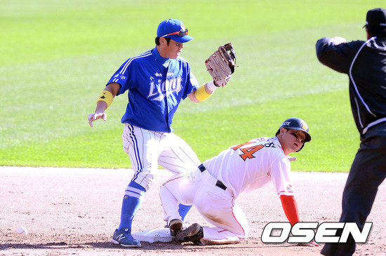 28일 오후 인천 문학구장에서 열린 2012 팔도 프로야구 삼성 라이온즈와 SK 와이번스의 한국시리즈 3차전, 1회말 1사 1루 SK 이호준의 타석때 1루 주자 최정의 도루를 막지 못한 삼성 조동찬 2루수가 글러브를 바라보고 있다.