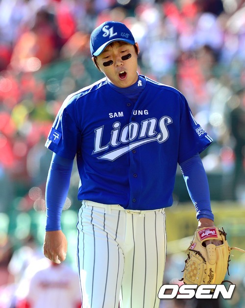 28일 오후 인천 문학구장에서 열린 2012 팔도 프로야구 삼성 라이온즈와 SK 와이번스의 한국시리즈 3차전, 1회말 1실점 한 배영수가 이닝을 마치고 불만스러운 표정을 짓고 있다.