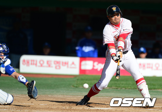 28일 오후 인천 문학구장에서 열린 2012 팔도 프로야구 삼성 라이온즈와 SK 와이번스의 한국시리즈 3차전, 1회말 1사 2루에서 SK 이호준이 헛스윙 삼진 당하고 있다.