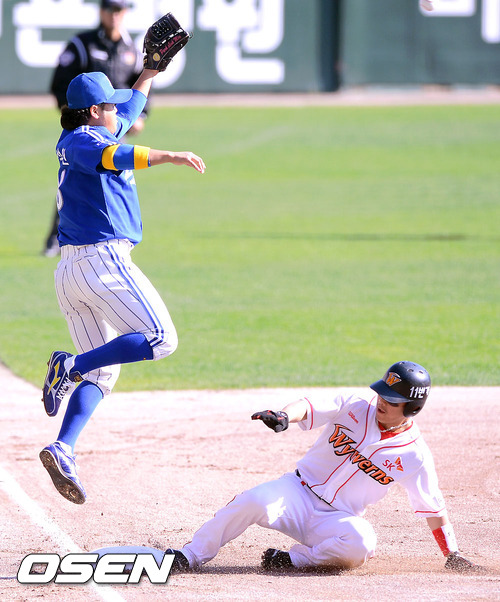 28일 오후 인천 문학구장에서 열린 2012 팔도 프로야구 삼성 라이온즈와 SK 와이번스의 한국시리즈 3차전, 1회말 2사 2루 SK 박정권의 타석때 배영수의 견제구가 뒤로 빠진사이 2루 주자 정근우가 3루에 세이프되고 있다.