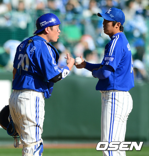 28일 오후 인천 문학구장에서 열린 2012 팔도 프로야구 삼성 라이온즈와 SK 와이번스의 한국시리즈 3차전, 2회말 삼성 진갑용이 마운드에 올라 배영수와 이야기를 나누고 있다.