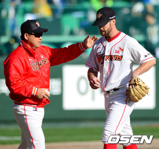 28일 오후 인천 문학구장에서 열린 2012 팔도 프로야구 삼성 라이온즈와 SK 와이번스의 한국시리즈 3차전, 3회초 무사 만루에서 SK 부시가 마운드를 내려오고 있다.