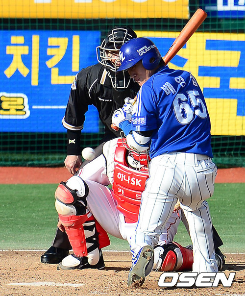 28일 오후 인천 문학구장에서 열린 '2012 팔도 프로야구' SK 와이번스와 삼성 라이온즈의 한국시리즈 3차전 경기 3회초 무사 2,3루 배영섭이 부시의 투구에 몸을 맞고 있다.