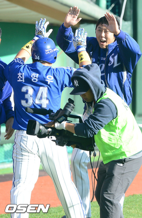 28일 오후 인천 문학구장에서 열린 2012 팔도 프로야구 삼성 라이온즈와 SK 와이번스의 한국시리즈 3차전, 3회초 1사 1,3루 삼성 최형우가 3점 홈런을 날린 후 동료들의 축하를 받고 있다