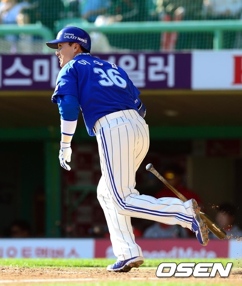 28일 오후 인천 문학구장에서 열린 2012 팔도 프로야구 삼성 라이온즈와 SK 와이번스의 한국시리즈 3차전, 3회초 무사 만루 이승엽이 역전 2타점 적시타를 치고 있다.