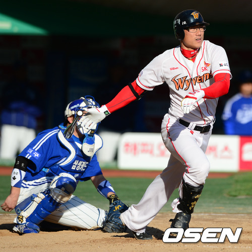 28일 오후 인천 문학구장에서 열린 2012 팔도 프로야구 삼성 라이온즈와 SK 와이번스의 한국시리즈 3차전, 3회말 2사 2루에서 SK 박정권이 1타점 적시타를 날리고 타구를 바라보고 있다.