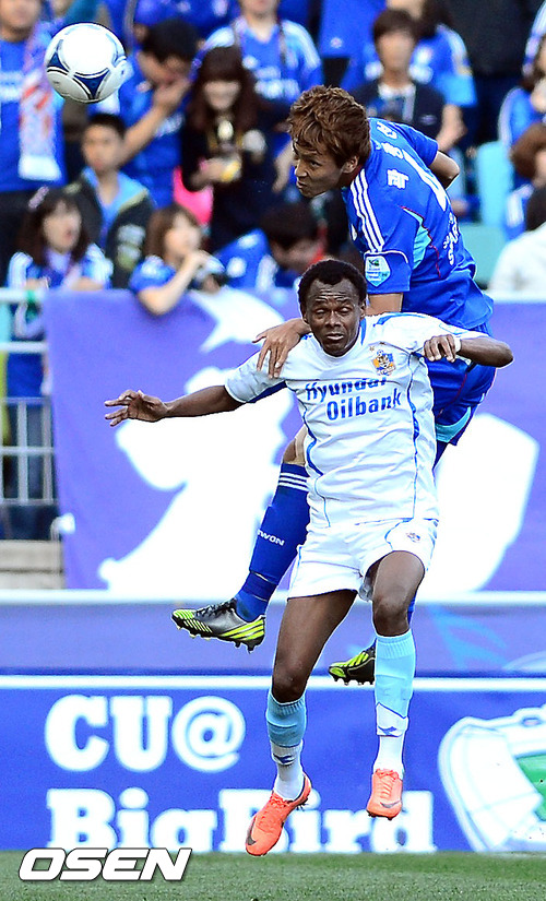 28일 오후 수원월드컵경기장에서 열린 '현대오일뱅크 K리그 2012' A그룹 37라운드 수원 삼성과 울산 현대의 경기, 전반 수원 곽광선과 울산 마라냥이 공중 볼다툼을 하고 있다.